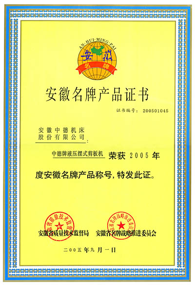 “中德牌”剪板機(jī)榮獲2005年“安徽名牌產(chǎn)品”稱號